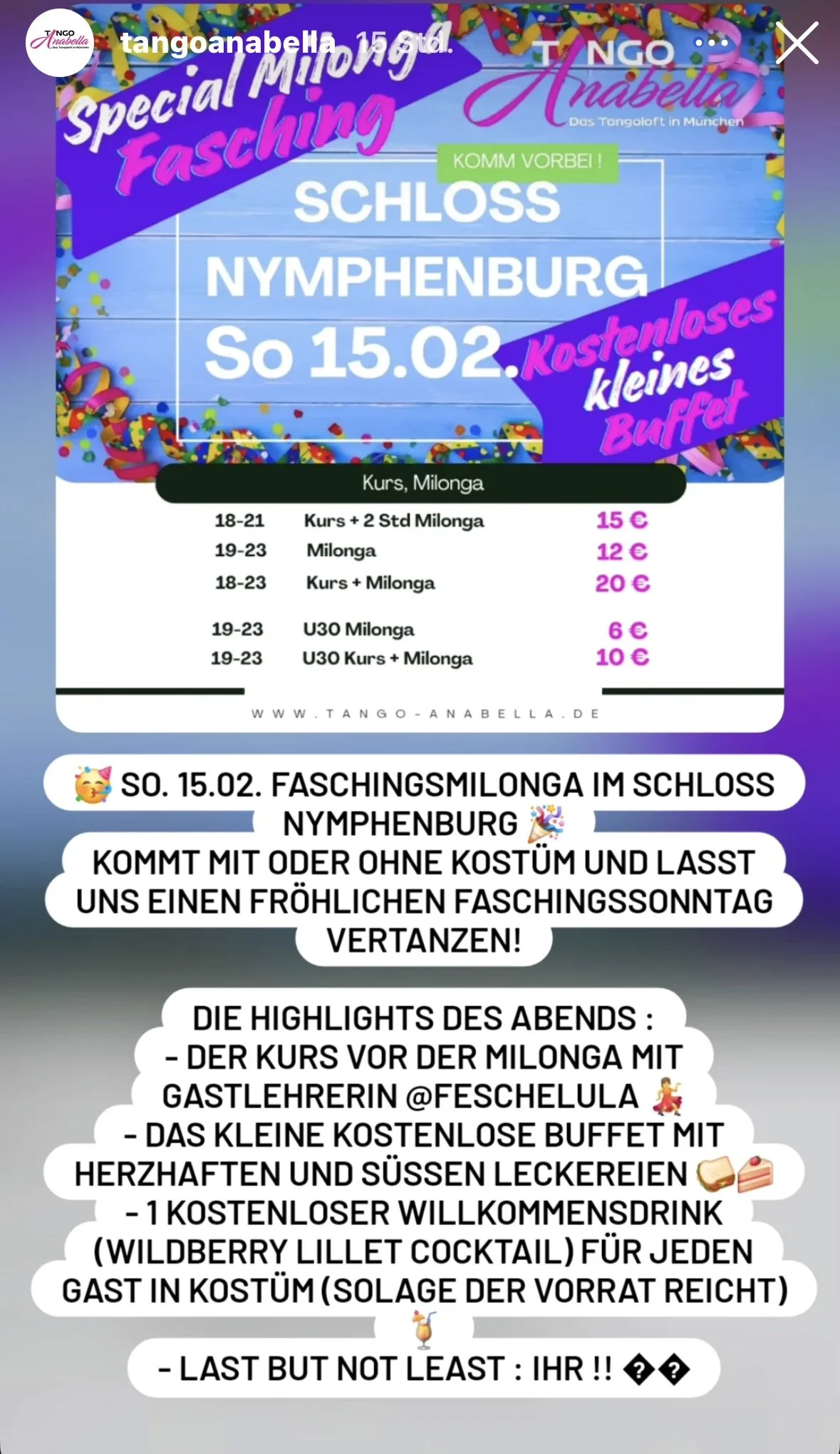 Die La Milonga de los Domingos zu Gast im Johannissaal von Schloss Nymphenburg in München. Gleich vorne im Nordflügel des Schlosses mit großen Fenstern und weiter Sicht auf das Schloss und die Parkanlagen, ein toller Parkettboden zum Tanzen, eine angenehme gedimmte Beleuchtung, einen schönen Drink oder guten Wein von der Bar, egal ob als Single oder mit Partner, genießt den Sonntagabend und den Tango.